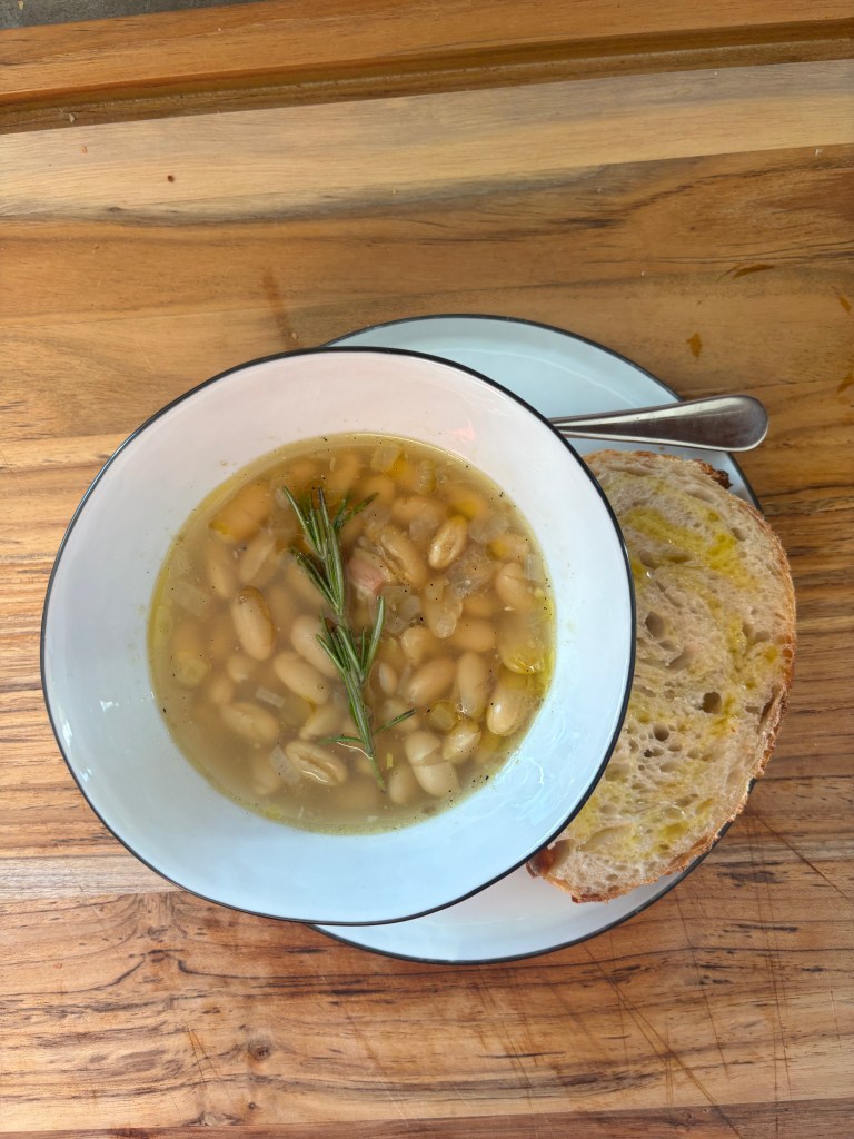 3. Incorporate beans into soup and submerge rosemary and bay leaf. Turn heat off and rest soup for 30 minutes.
